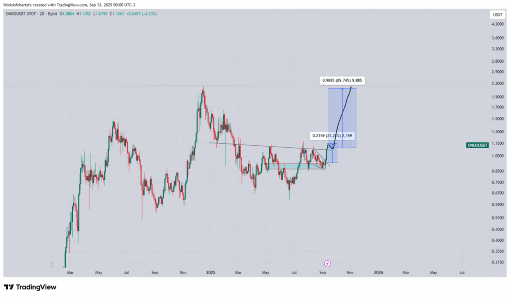 Technically, OND/USDT broke out of a long downtrend line that was a significant level of resistance earlier. The breakout was corroborated by a successful retest at the $0.85-$0.90 level of support, where demand came in and turned prices around. However, the current price at $1.08 means momentum is currently holding firm and the first near-term target is in the region around $1.15.