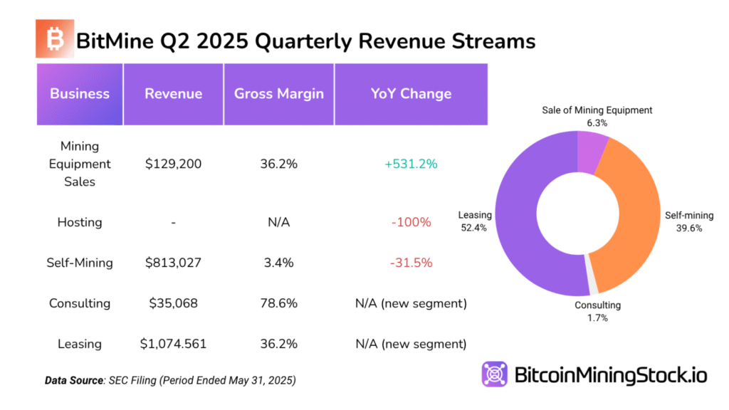 Its latest quarterly results showed solid growth. Revenue hit $2.05 million, nearly double year-over-year. Most of it came from ASIC leasing deals. Self-mining had very thin profit margins, highlighting the challenges of small-scale mining. The company’s consulting segment, while small, delivered high margins and signaled potential for expansion.