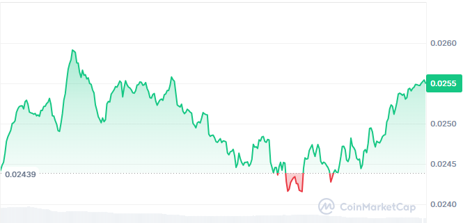 VET trades at $0.02555 with a slight 0.03% increase daily. Intraday trading is between $0.02414 and $0.02591, indicating strong compression of price action. Furthermore, market cap stands at about $2.2 billion, with trading volume between $60-$90 million on major exchanges.