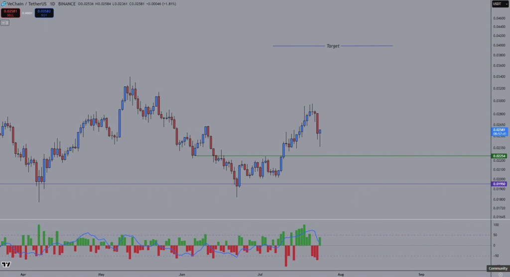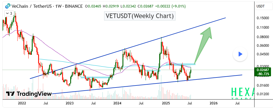 A breakout over $0.035 can initiate a strong rally. Technical analysts project immediate upside targets of $0.06 to $0.10 should further gains be realized. In a bullish scenario, VET can advance to the high end of the wedge formation, keeping its long-term bullish formation intact.